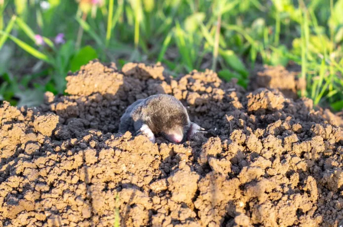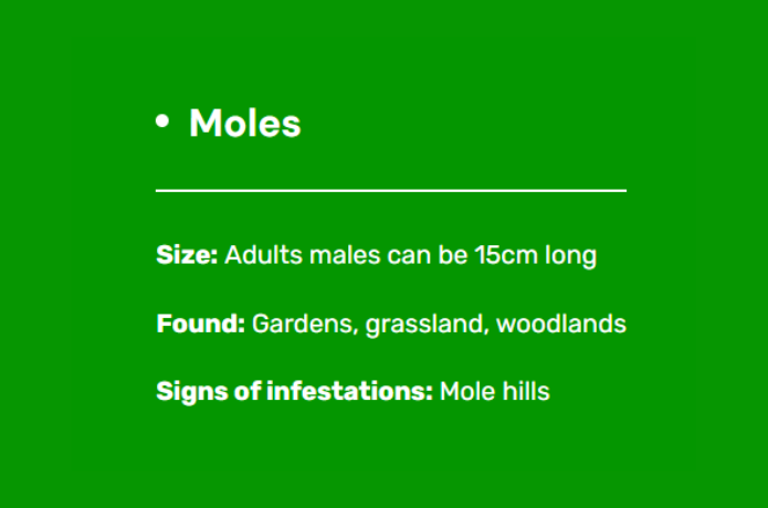 Moles and their molehills are a nuisance to gardeners and farmers. Moles are covered with silky black fur, which moves backwards or forwards to allow the mole to travel backwards and forwards. A tunnel system can be as long as 50 metres.